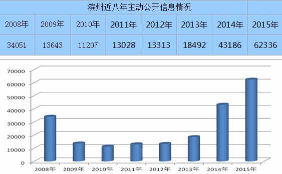截至2015年12月31日,全市本年度新增主動(dòng)公開政府信息62336條。其中,市級(jí)機(jī)關(guān)主動(dòng)公開政府信息8087條;縣(區(qū))政府主動(dòng)公開政府信息54249條。從發(fā)布數(shù)量看,縣(區(qū))政府中,無棣縣(13062條)、鄒平縣(11269條)、博興縣(9258條),分列前三名;